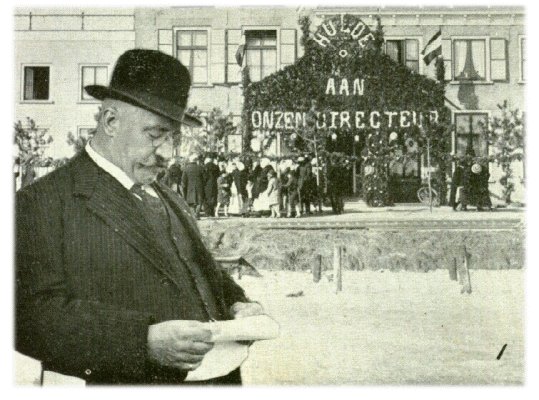 Wilhelminadorp, 1929, 1 Maart j.l. was het 35 jaar geleden dat de heer H.A. Hanken te Wilhelminadorp benoemd werd tot directeur van den grootsten polder van Nederland, den Wilhelminapolder. Dit jubileum is in den polder, waar de heer Hanken als een vader van zijn menschen beschouwd wordt, natuurlijk uitbundig gevierd. De eerste drie foto's getuigen daarvan. De versierde woning van den directeur en op de voorgrond de jubilaris.