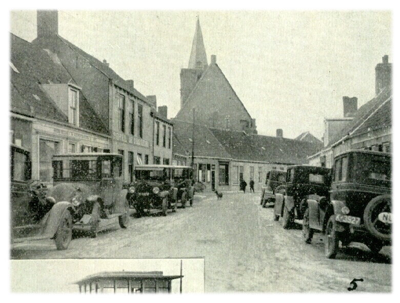 Kortgene, 1929, Parkeerende auto's in de Kaaistraat te Kortgene tijdens de Markt.