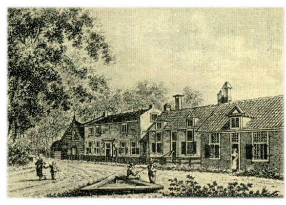 Schore, 1929, Schore omstreeks 1755 (2) (klik voor de rest van de tekst).b:De Dorpsstraat. Links op bovenstaande afbeelding ziet men de groote boomen van het kerkhof die op de vorige afbeelding rechts staan. Beide afbeeldingen vormen dus naast elkander een geheel. Op den voorgrond de z.g.n. driehoek, een "klapbank", die enkele jaren geleden is afgebroken. Wie Schore van thans kent, zal opmerken, dat de veranderingen ter plaatse niet groot zijn geweest.