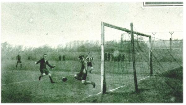 Spelkiek uit den wedstrijd Vlissingen II-De Zeeuwen. Aanval op het doel van Vlissingen.