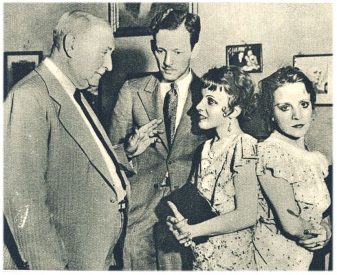 Violet, een van de Amerikaansche Siameesche tweeling Hilton, wilde trouwen, doch de vergunning werd door de autoriteiten niet gegeven. Een ambtenaar (links) kwam de boodschap brengen welke een einde maakte aan een liefdesgeschiedenis, die natuurlijk weer gebruikt werd om er op min of nmeer smakelooze wijze reclame mede te maken