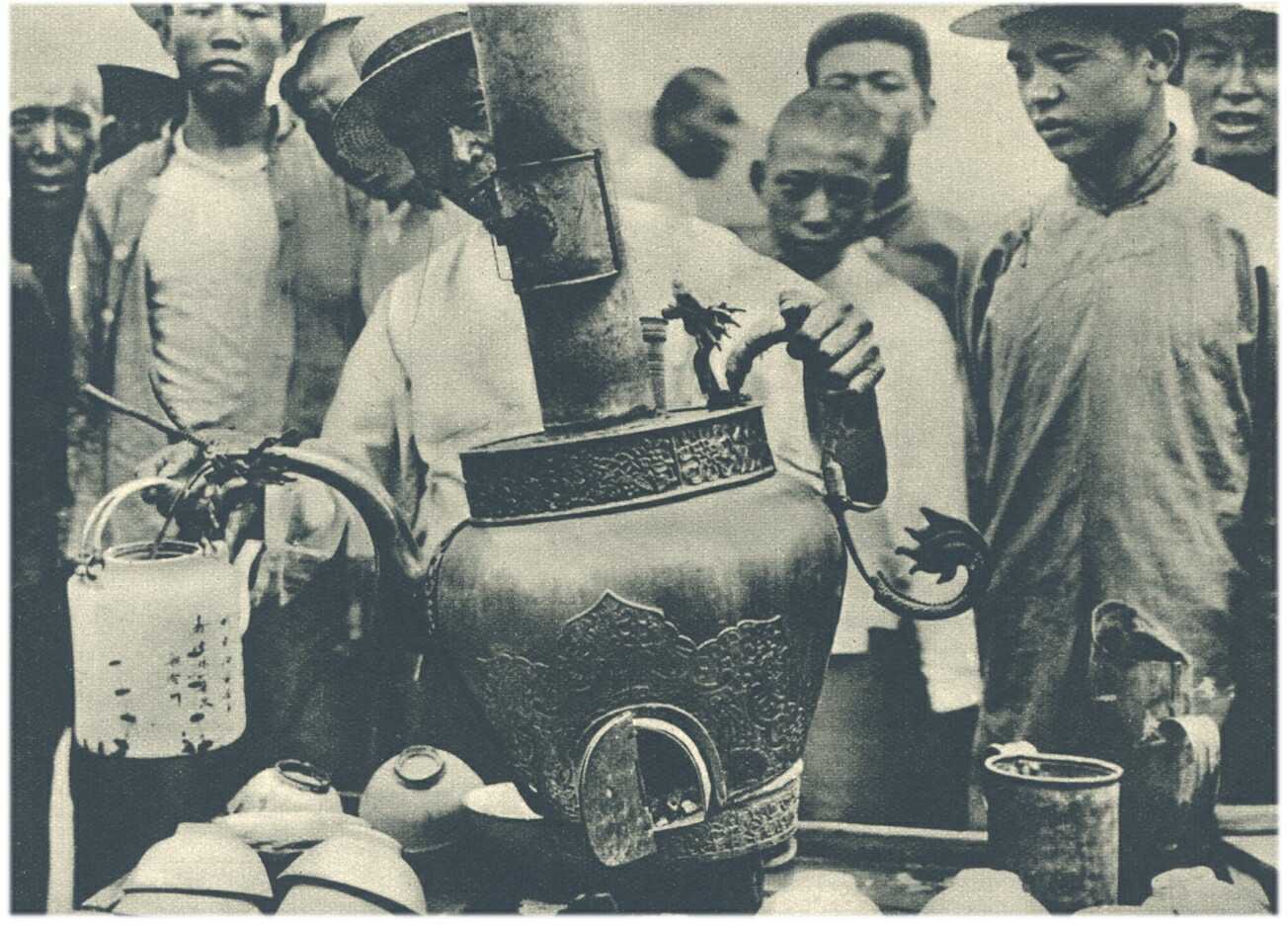 Het "water- en vuurzaakje", dat vroeger ook in onze steden bekend was, bestaat nog in China. De ketel, die tegelijk fornuis en waterketel is, wordt op straat rondgereden, waar men voor enkele centen kokend water voor de thee kan krijgen