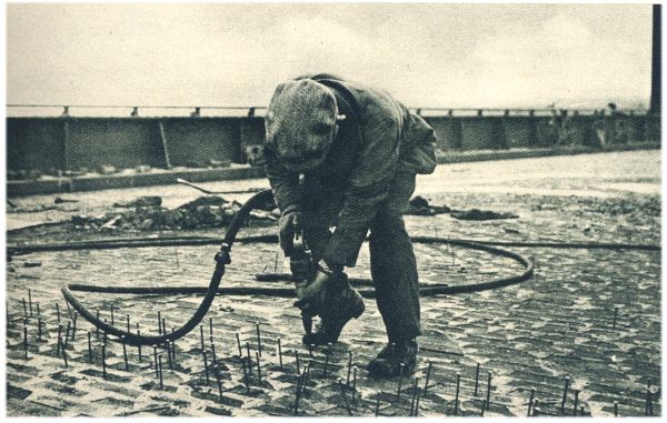 Het wegdek op de nieuwe Rijnbrug bestaat uit houten blokjes, die met een teermengsel aan elkaar worden bevestigd en daarna gespijkerd worden. Het spijkeren geschied machinaal