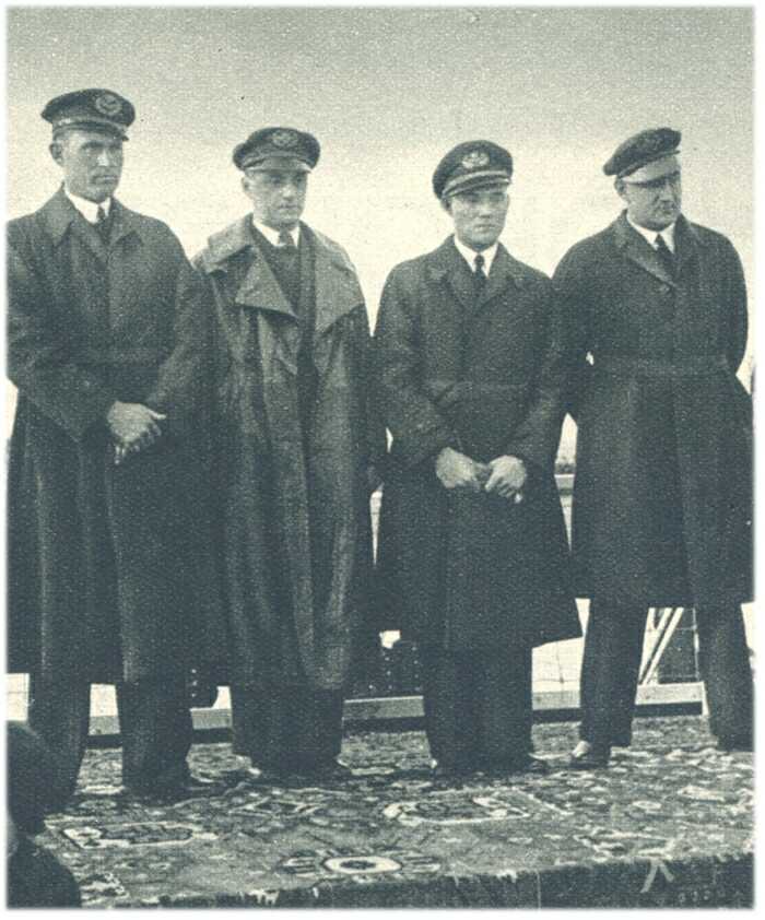 Hulde voor de Uiver. De vier van de Uiver: v.l.n.r. Prins (werktuigkundige), Moll (tweede piloot), Parmentier (gezagvoerder) en v. Brugge (marconist)