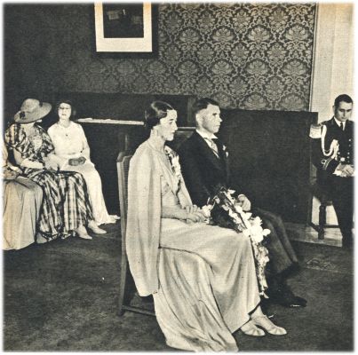 De landvoogdsdochter trouwt. De huwelijksplechtigheid in een der zalen van het paleis te Buitenzorg: het bruidspaar tijdens de toespraak van de ambtenaar van den burgelijken stand, den heer De Koning, gewestelijk secretaris