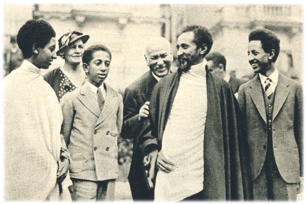 Een foto van keizer Haile Selassie met z'n twee zoons en dochter in den tuin van het Abessijnsche gezantschap te Londen. Achter den keizer de gezant, Dr. Martin