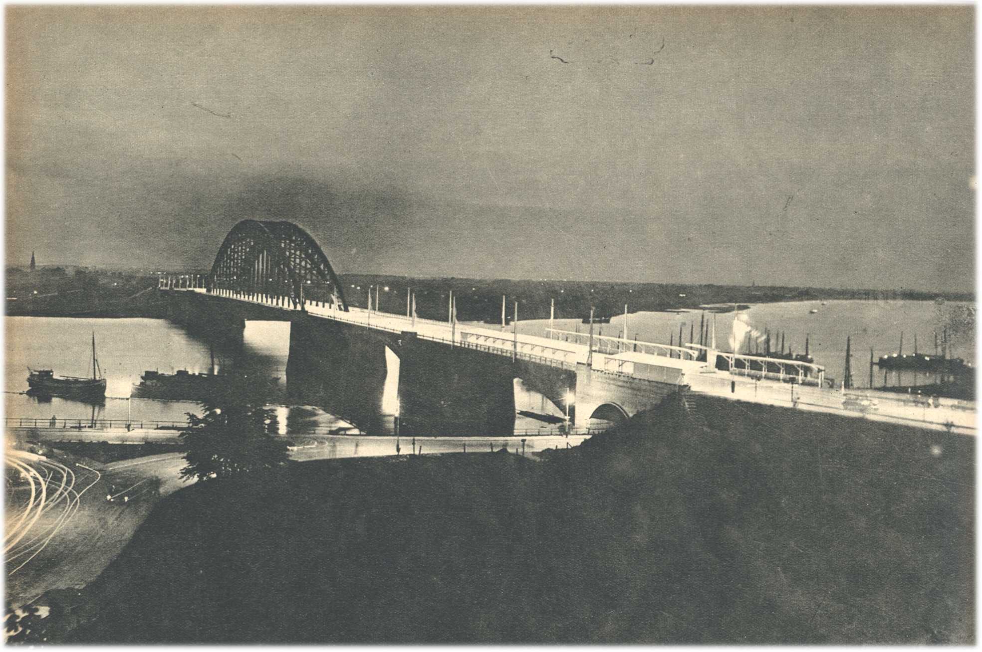 De Waalbrug te Nijmegen, welke dezer dagen door H.M. de Koningin plechtig geopend werd, in den avond gezien, verlicht met Philips "Philora" natrium-lampen