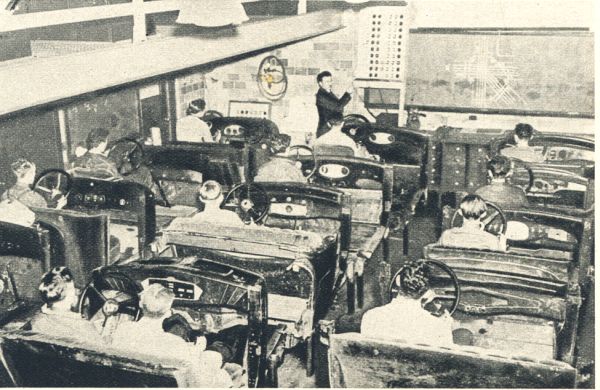 Een eigenaardige chauffeursschool werd onlangs te Chicago geopend - de leerlingen zitten in halfgesloopte wagens, waarvan de stuurinrichting behouden is gebleven. Pedalen, stuur en signaal staan in verbinding met roode lampjes naast het demonstratiebord, zoodat de leeraar onmiddellijk kan zien, wie van z'n leerlingen een fout gemaakt heeft