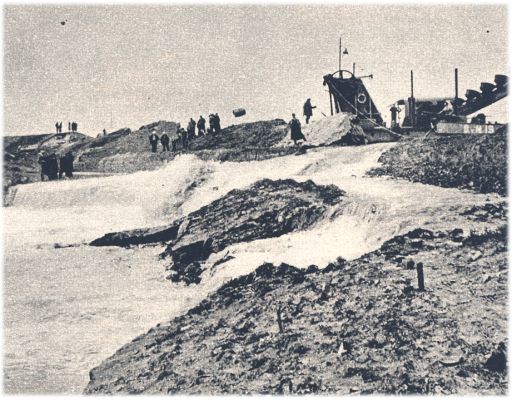 Een gewichtig stuk werk. Het water heeft reeds een opening in den dijk gemaakt en stroomt met groote kracht naar binnen